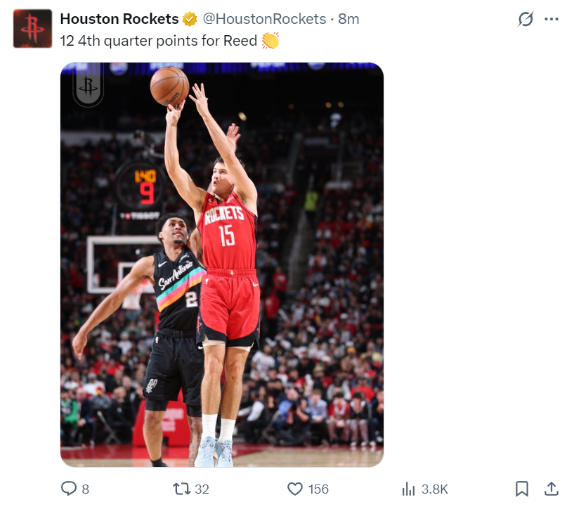 这场比赛火箭后卫里德-谢泼德登上了全美第三热搜,因为他这场比赛沉寂了三节后在末节最关键的时刻挺身而出,他单节12分帮助火箭逆转西部第二的马刺,火箭也拿到了三连胜。